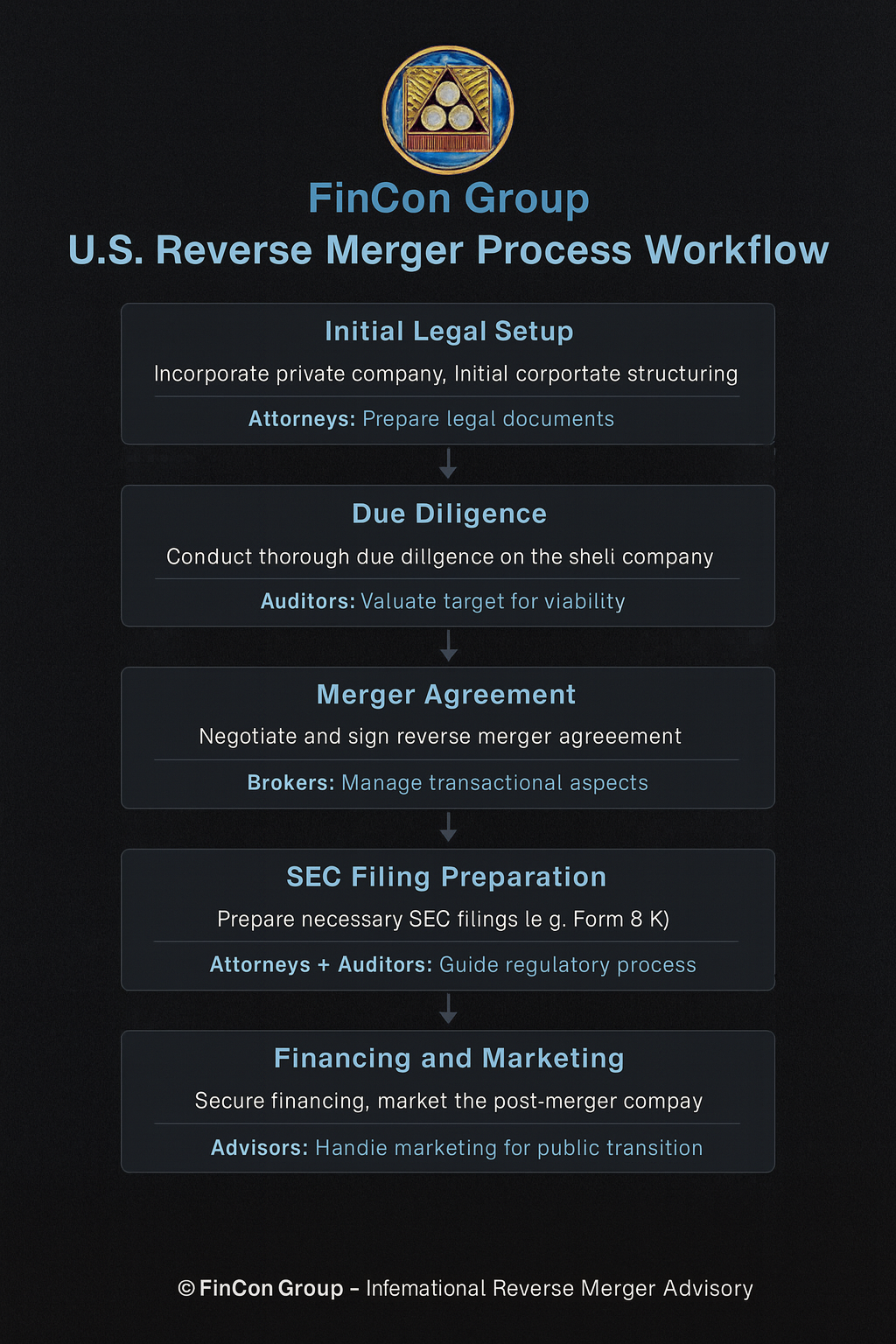 Determine best merger structure (share exchange, triangular merger, or direct takeover). Identify target exchange (OTCQB, NASDAQ, NYSE). |