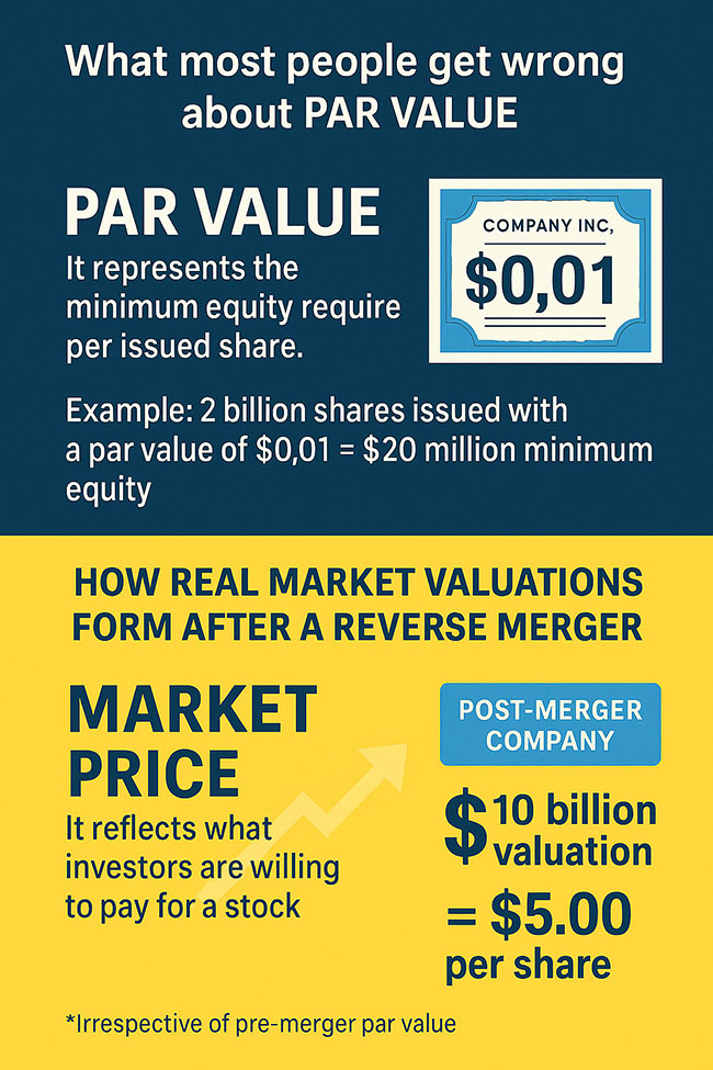 This is because the US operates on a completely different, much more flexible model: Par values (nominal values) are purely technical figures. They bear little relation to actual contributions, the true value of the company, or the subsequent stock price. This very difference - especially in international reverse mergers and capital measures - repeatedly leads to incorrect assumptions.